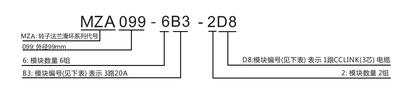 *比如MZA099-6B3-2D8, 其中6B3-2D8是指:6組3路20A(即18路20A)+2組1根CCLINK(3芯)電纜